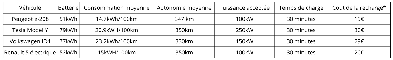 En fonction de la puissance acceptée par le véhicule, le temps de charge peut varier de manière significative. Retrouvez nos estimations de temps de charge et de coût moyen pour différents véhicules.
